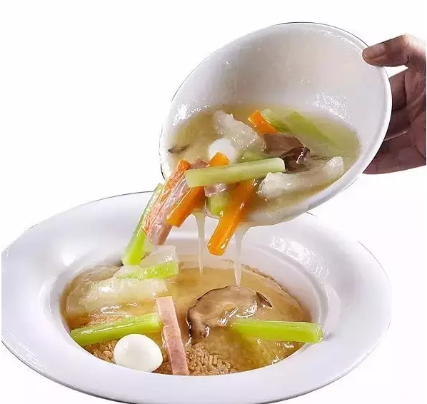 把鍋巴放熱油鍋里炸酥脆,與燴好的蹄筋一起上桌。當著客人面把燒好的蹄筋倒在鍋巴上面,在聽到“吱吱”的聲響后,即可食用。