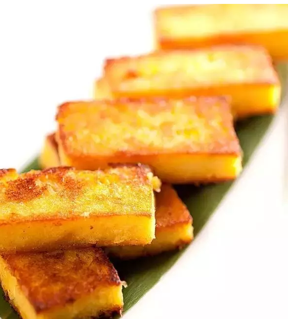把水果玉米磨成粉漿,入盆加雞蛋和糯米粉調勻后,再倒在不銹鋼平盤內,入籠蒸熟便取出來切成塊,在油鍋里煎香便可裝盤上桌。