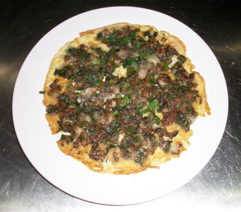 必須把鐵鍋洗凈避免黏鍋、造成海蠣煎煎不成功,把鍋底水份燒干、放少許油燒成在60度再把鍋里油倒出,再放50克油,倒入海蠣攪拌好用溫火煎成圓形凝固,小心搖鍋翻面(搖鍋是有技術),海蠣剪成7-8分熟后再把雞蛋順著海蠣邊繞圈澆下去,搖鍋翻面2-3次,那個圓盤后雞蛋煎變成金黃色即可出鍋。